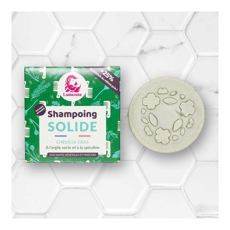 Le shampoing solide pour cheveux gras contient 2 actifs 100% français : l’argile verte et la Spiruline pour des cheveux forts et un cuir chevelu purifié.